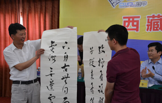 發(fā)布會(huì)最后曹大元九段代表兩隊(duì)棋手像王斌贈(zèng)送國(guó)手簽名的棋盤,王斌則用三幅字回贈(zèng)兩隊(duì)。