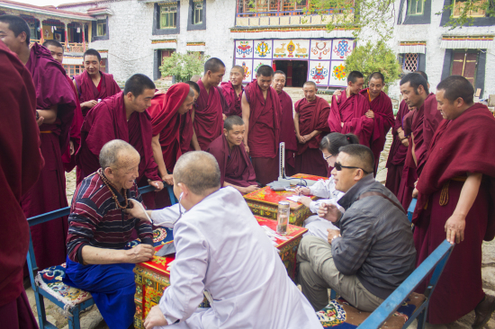 義診現(xiàn)場(chǎng),醫(yī)療隊(duì)熱情接待每一位前來(lái)就診或咨詢(xún)的僧侶,為其看病、發(fā)放藥品及講解日常健康知識(shí)和自我保健的方法,僧侶們也由一開(kāi)始的只是駐足觀(guān)望轉(zhuǎn)為積極上前就診,并主動(dòng)向醫(yī)療隊(duì)闡述自己的病狀,同時(shí)針灸科李泉濤醫(yī)生更是不間斷地為多位經(jīng)常久坐寺中的僧侶推拿與按摩頸、肩、腰、腿等各個(gè)部位。中午時(shí)分,醫(yī)療隊(duì)還受邀與僧侶們一起吃齋飯。