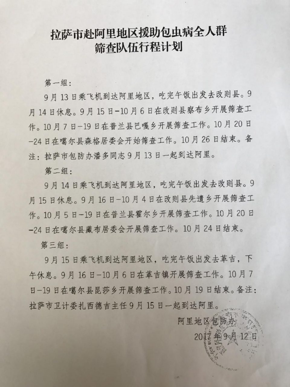 經(jīng)了解,此次包蟲篩查工作,拉薩市衛(wèi)計(jì)委邀請并組織3支共18人的醫(yī)療小分隊(duì)。我院是第三組,分在阿里的革吉鎮(zhèn)和噶爾縣昆莎鄉(xiāng)兩個(gè)篩查點(diǎn),共將篩查3564人。另外兩組分別是改則縣察布鄉(xiāng)(2650人)和先遣鄉(xiāng)(2050人)。從分配工作計(jì)劃上看我組分配的篩查人員最多,人員也比較分散,給工作增加了難度,小組預(yù)計(jì)將9月17日~10月19日完成篩查工作。
