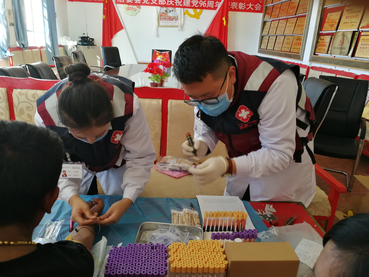 鐘義華、劉亞美、丁雪琴分到另一組,負責(zé)采血和血樣信息錄入工作。鐘義華是檢驗士也是隊長,更是我們醫(yī)療隊唯一的男孩子,重活、粗活全包,還要負責(zé)隊員的工作安排,以及與政府領(lǐng)導(dǎo)、工作人員的溝通協(xié)調(diào),除此之外,他還要負責(zé)血樣采集、包蟲病防治的宣傳。