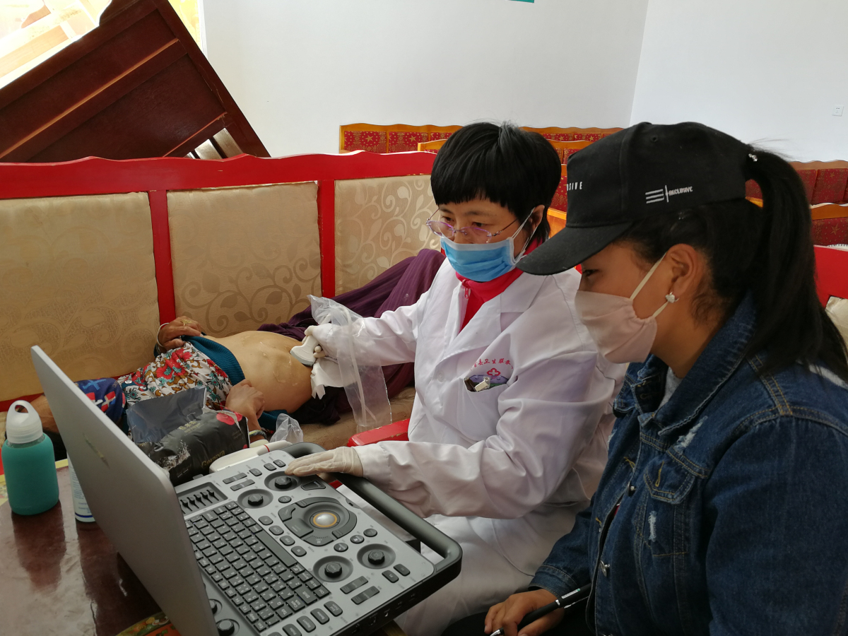 劉冬梅醫(yī)生和格桑拉吉被分到一組,負責(zé)B超檢查,在這里大部分群眾不會漢語,格桑拉吉除了要負責(zé)B超檢查、做錄入還要負責(zé)翻譯工作。遵照黨委書記王斌同志的指示,劉冬梅醫(yī)生除了要高質(zhì)量地完成政府安排的肝臟B超檢查外,還要額外為群眾檢查膽、腎臟,這無疑極大地增加了她的工作量。在工作中的她兢兢業(yè)業(yè),一絲不茍,那專注的神情,是我見過的最美的樣子。
