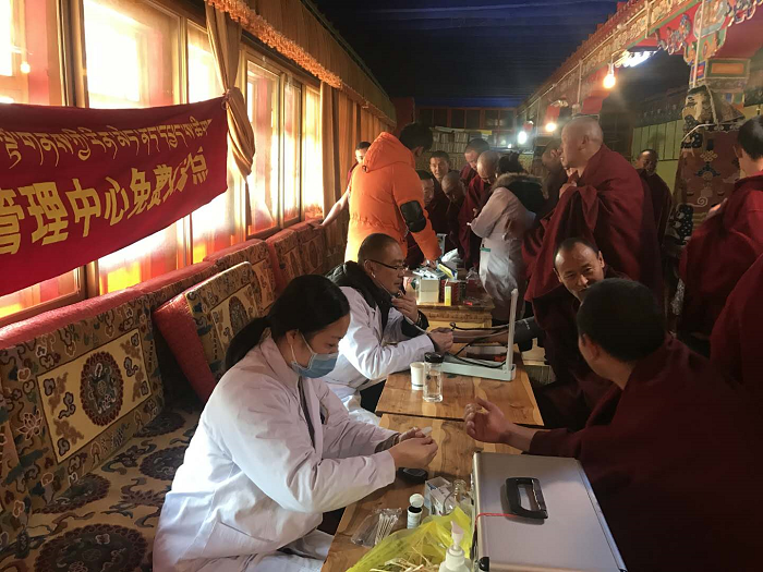 由于當天寺廟在進行法會活動,有部分僧侶沒有到場。義診隊共計為200多名僧侶進行了體檢,期間得到了羅布次仁處長、索次主任的大力支持與幫助。在離開寺廟時,羅布次仁處長握著田豐輝醫(yī)生的手深切地說:“你們辛苦了!”其言雖短,但至真至切。