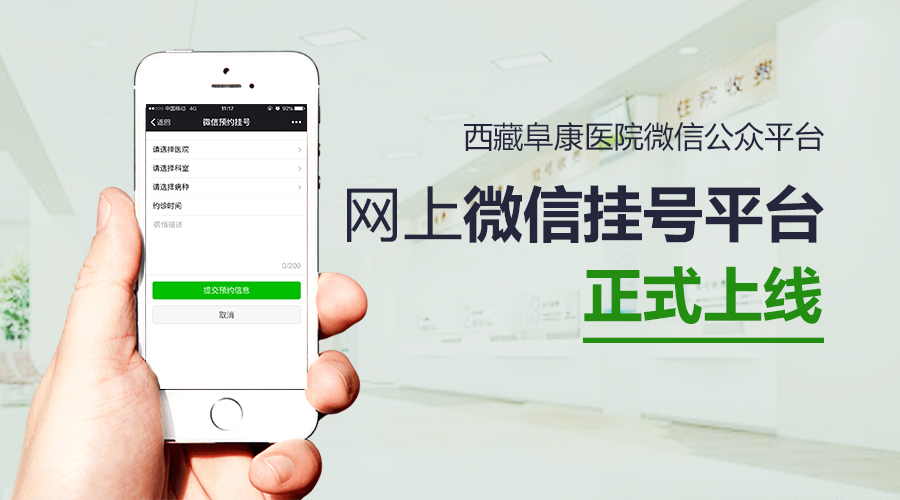 針對(duì)開通微信公眾平臺(tái)網(wǎng)上預(yù)約掛號(hào)系統(tǒng)的目的,西藏阜康醫(yī)院信息科工作人員說:“圍繞老百姓‘排長(zhǎng)龍’、看病難這個(gè)核心問題,我們運(yùn)用互聯(lián)網(wǎng)技術(shù)為患者減輕負(fù)擔(dān),減少患者在醫(yī)院排隊(duì)等候的時(shí)間,緩解患者掛號(hào)難的問題。經(jīng)過開發(fā)、調(diào)試,5月24日,西藏阜康醫(yī)院微信公眾平臺(tái)網(wǎng)上預(yù)約掛號(hào)系統(tǒng)正式上線。接下來將根據(jù)市民的使用體驗(yàn)、反饋意見,對(duì)系統(tǒng)進(jìn)行完善。”