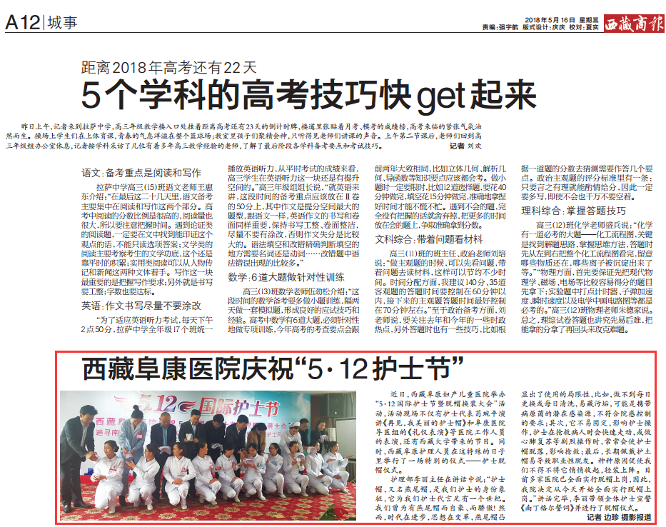 近日,西藏阜康婦產兒童醫(yī)院舉辦“5·12國際護士節(jié)暨脫帽換裝大會”活動,活動現場不僅有護士代表荀琬平演講《再見,我美麗的護士帽》和阜康醫(yī)院導醫(yī)組的《禮儀表演》等醫(yī)院工作人員的表演,還有西藏大學帶來的節(jié)目。同時,西藏阜康護理人員在這特殊的日子里舉行了一場特別的儀式——護士脫帽儀式。