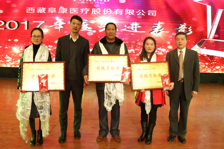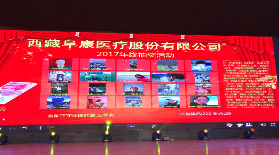 2018年1月10日,西藏阜康醫(yī)療股份有限公司新年團(tuán)拜會在拉薩洲際酒店舉行,下午四點來自西藏阜康醫(yī)院、婦產(chǎn)兒童分院、心腦血管分院、健康體檢中心,阜康大藥房、超市的員工陸續(xù)來到會場。下午五點,主持人劉連福院長宣布會議正式開始,場內(nèi)音樂響起,董事長王斌帶領(lǐng)醫(yī)院領(lǐng)導(dǎo)和特邀嘉賓入場,會場立刻響起雷鳴般的掌聲和歡呼聲。