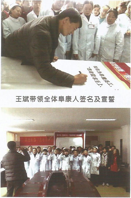 當(dāng)日下午,筆者在兩家醫(yī)院看到,西藏阜康醫(yī)藥超市和兩家醫(yī)院的全體醫(yī)護(hù)人員乃至醫(yī)院的保安都在“患者需求至上,團(tuán)隊精誠協(xié)作”的大型橫幅上簽上了自己的姓名。王斌董事長說:為了讓醫(yī)院全體人員時刻牢記“病人至上”的理念,通過簽名的方式時刻刺激醫(yī)院員工服務(wù)意識的神經(jīng),從而達(dá)到“服務(wù)來自于心”的效果。