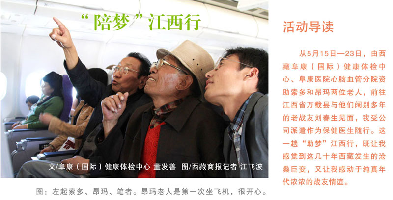 我們5月15日從拉薩出發(fā),一路向東,到成都轉(zhuǎn)機,兩天的時間,已經(jīng)跨越了2400多公里。16日,載著夢想的飛機抵達(dá)了江西南昌機場,劉春生老人的大兒子在機場熱情地迎接我們,將我們接到老人的故鄉(xiāng)萬載縣。我們決定在縣城賓館休息一天后再啟程前往劉春生老人的家,于是我為同行的兩位老人做了全面的檢查,索多老人的血糖在7.0mmol/L左右,令我擔(dān)心的是昂瑪老人血壓本來就偏高而且又是第一次去內(nèi)地,他的血壓波動在140-150/90-100mmHg,比較平穩(wěn),我叮囑老人見面時注意控制情緒,不要過于激動。