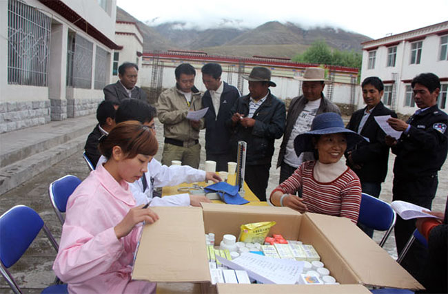 通過為尼木縣鄉(xiāng)村小學(xué)老師們的體檢,董發(fā)善醫(yī)生說:“大部分老師都患有血管神經(jīng)性頭疼和不同程度的胃病和膽囊疾病。這是由于在鄉(xiāng)村學(xué)校中,老師們工作繁忙,經(jīng)常忘記吃飯或者到了吃飯的時(shí)候就湊合吃幾片風(fēng)干肉,喝幾杯酥油茶。這是造成鄉(xiāng)村老師腸胃和膽囊疾病的主要原因。此外,由于老師們經(jīng)常站著講課,腰椎疾病的患病率比其他行業(yè)的要高。”在體檢的同時(shí),醫(yī)護(hù)人員還向老師們發(fā)放了常見疾病預(yù)防知識(shí)的宣傳材料。