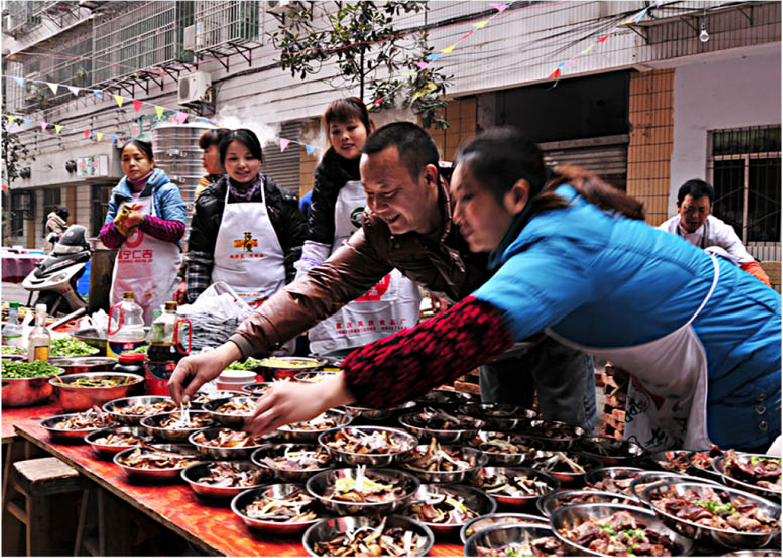 要操辦一場壩壩宴,首先要請一個專業(yè)的“廚子”,他會提前幾天跟主人溝通好菜單。給你時間買好材料、宰殺牲畜、劈好柴火、挖好土灶(上大蒸籠用),去專門租賃土碗杯碟和蒸籠的人家“聘碗”,再請幾個妯娌幫忙當(dāng)天打下手,請幾個壯年男人“掌盤” (傳菜)。其次要請“知客”(相當(dāng)于現(xiàn)在的婚禮、壽慶司儀),專門為主人登記彩禮,活躍氣氛,安排賓客活動。