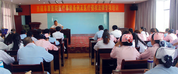 為了加強我院醫(yī)療質(zhì)量和醫(yī)療安全管理,防范醫(yī)療糾紛和醫(yī)療損害及事故,提高醫(yī)療糾紛調(diào)處能力和水平,創(chuàng)建和諧的醫(yī)患關(guān)系,2014年6月14至15日,我們特別邀請到西藏偉豪律師事務(wù)所律師同時也作為我院法律顧問的胡可律師到我院開展為期兩天的“關(guān)于醫(yī)療事故條例及醫(yī)療侵權(quán)”的法律專項培訓(xùn)。