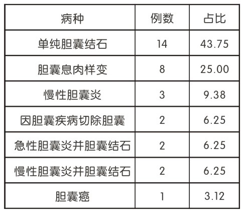 273名體檢者中241例未見明顯膽囊異常,占比為88.28%,32例查出膽囊疾病,占比為11.72%。32例膽囊疾病中單純膽囊結(jié)石比例最高,為14例,占比43.75%;膽囊息肉樣變占比第二,為8例,占比2500%;其他10例中,3例為慢性膽囊炎(9.38%),2例為因膽囊疾病切除膽囊(6.25%),2例為急性膽囊炎并膽囊結(jié)石(6.25%),2例為慢性膽囊炎并膽囊結(jié)石(6.25%),1例為膽囊癌(3.12%),具體見下表。