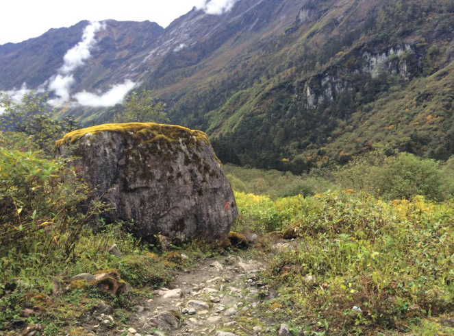 接下來順江而下的兩三個小時的路略微好走些,雖然布滿碎石斷巖,稍微不慎就會絆倒滑摔,但比起在冰天雪地、刺心寒凍的雪風(fēng)雪雨中行走這已經(jīng)是無比的輕松了。