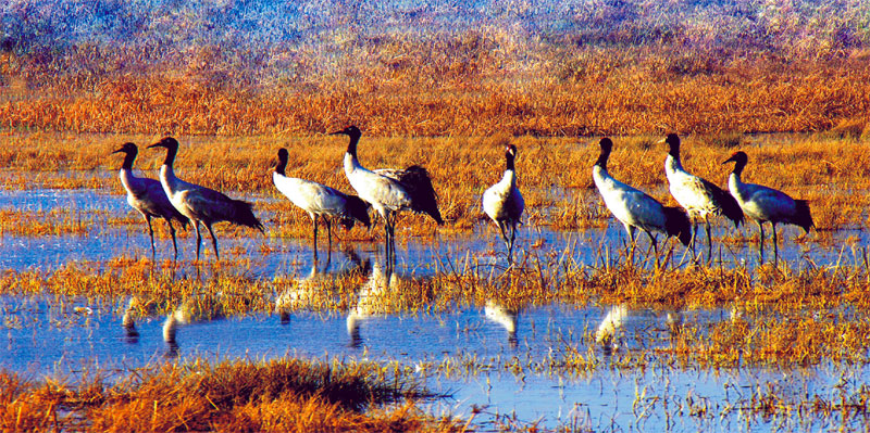 好不容易見到三只,小彭一邊扭著身子一邊低聲自語(yǔ):“黑頸鶴呀黑頸鶴,你轉(zhuǎn)過(guò)身子抬起頭來(lái)看看我。又不是孔雀,干嗎總把屁屁朝這邊。”黑頸鶴不懂人語(yǔ),也懶得猜人的心思。有一點(diǎn)可以保證,這里雖然車來(lái)人往,卻是安全的。