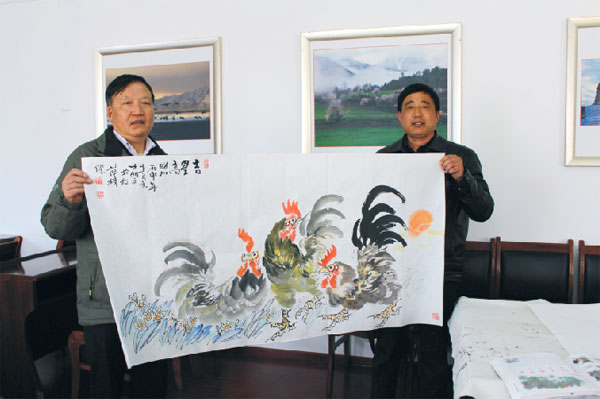 3月28日受自治區(qū)文聯(lián)黨組書(shū)記兼副主席沈開(kāi)運(yùn)邀請(qǐng)陳明文先生在自治區(qū)文聯(lián)會(huì)議室作文化交流。交流會(huì)上陳明文先生展示了自己的近期作品,沈開(kāi)運(yùn)主席代表自治區(qū)文聯(lián)收錄了其畫(huà)作《吉星高照》。