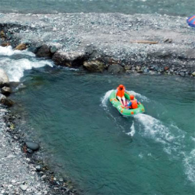 翌日,一大早醒來推開窗戶,便被外面的風(fēng)景迷住了。霧氣形成一道道白色的緞帶,披在了群山的肩上腰間。木樓的露天陽臺上,同事們都在不停的感嘆和拍照,亦有人在閉目養(yǎng)神,感受大自然的氣息。一起吃過早餐,車隊便駛向白沙河畔,開始了我們期待已久的重頭戲——虹口漂流。虹口漂流被譽為“西部第一漂”,全程近萬米,且落差明顯,不但能讓人享受“乘風(fēng)破浪,激情飛揚”的驚險樂趣,也能讓人感受到“遠喧囂而返林、近山野而歸真”的生態(tài)魅力。自由漂的皮艇兩人一艇,經(jīng)過初步的適應(yīng)之后,不同皮艇上的同事們紛紛拿起水瓢,水槍,頭盔等互相潑灑起來,而岸邊的游客也不甘寂寞,拿起各種“武器”參與進來。